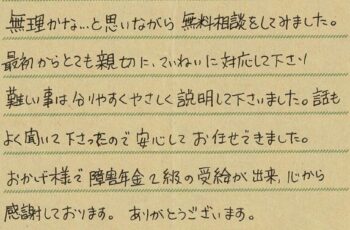 うつ病 双極性障害(20代 女性) 障害年金2級の受給ができ、大変うれしく思っております。 サポートが手厚く、ちょっとした疑問でも電話ですぐに答えてくださり、とても安心しました。 大変感謝しております。 あ […]