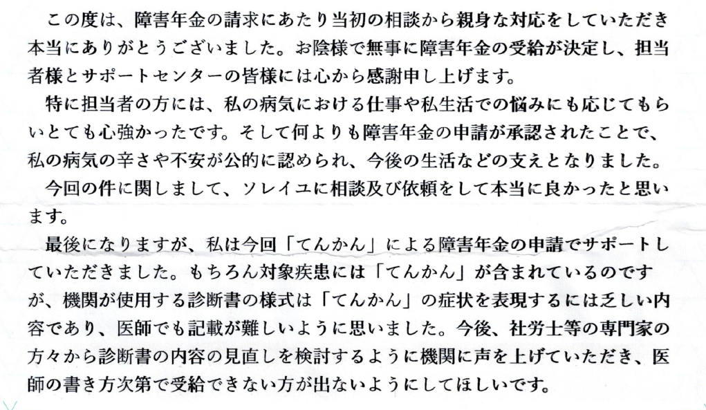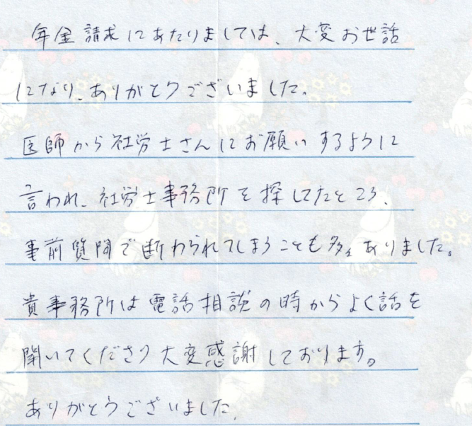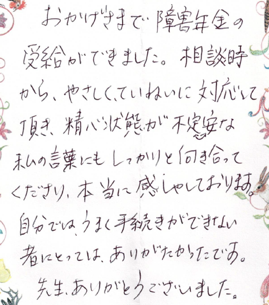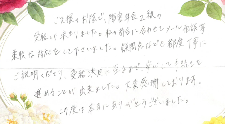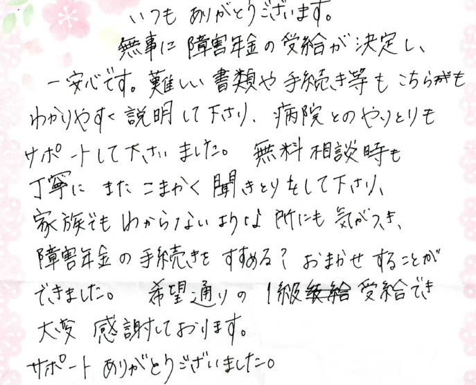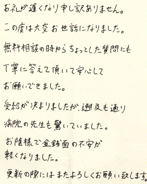 (スタッフより)                                                                             この度はお手紙をいただきありがとうございました。受給が決まり私共も大変うれしく思っております。今後もご依頼者様に寄り添い、丁寧なサポートを心掛けてまいります。