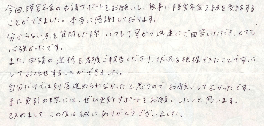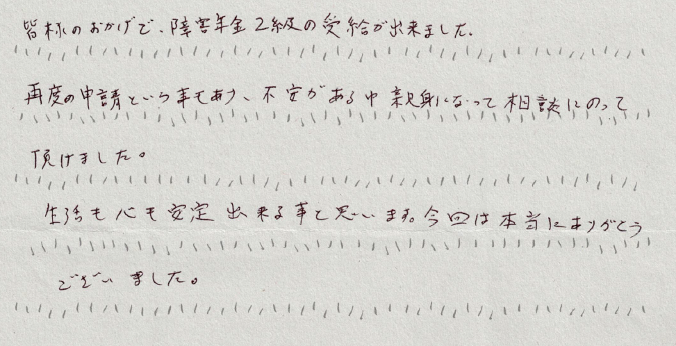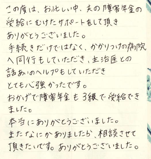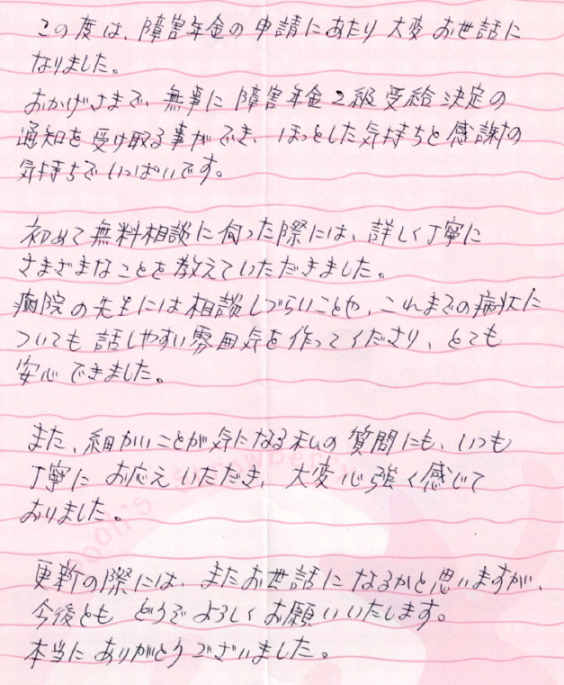 (スタッフより) この度はお手紙をいただきありがとうございました。受給が決まり私共も大変うれしく思っております。今後もご依頼者様の気持ちを第一に考えながらサポートをしていきたいと思います。
