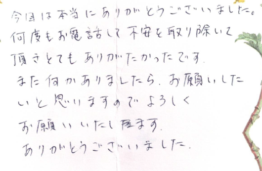 何度もお電話して不安を取り除いて頂きとてもありがたかったです。