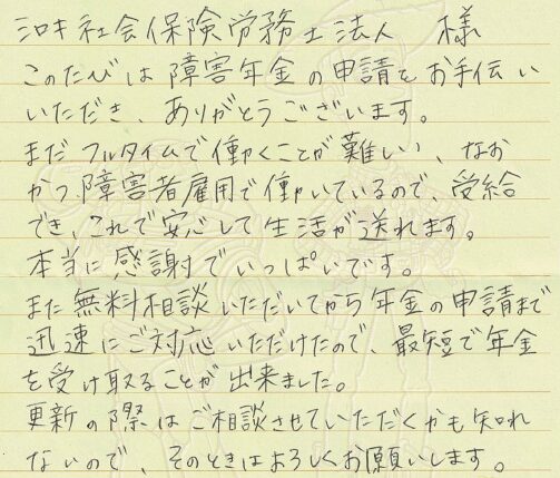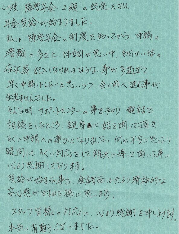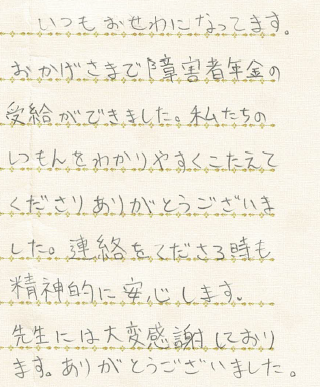 (スタッフより) この度はお手紙をいただきありがとうございました。受給が決まり私共も大変うれしく思っております。今後も安心してご依頼していただけるよう精一杯サポートさせていただきたいと思います。