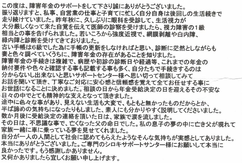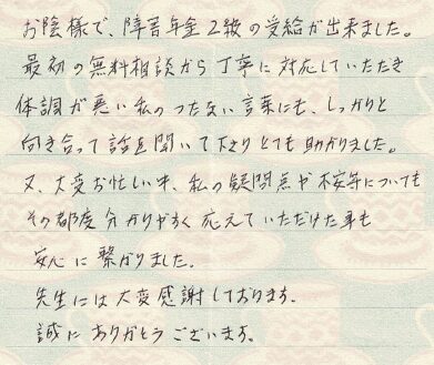 この度は、障害年金のサポートをして下さり誠にありがとうございました。