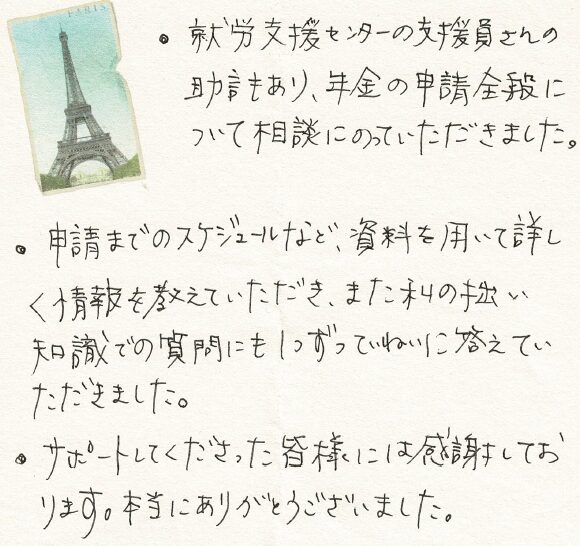 就労支援センターの支援員さんの助言もあり、年金の申請全般について相談にのっていただきました。