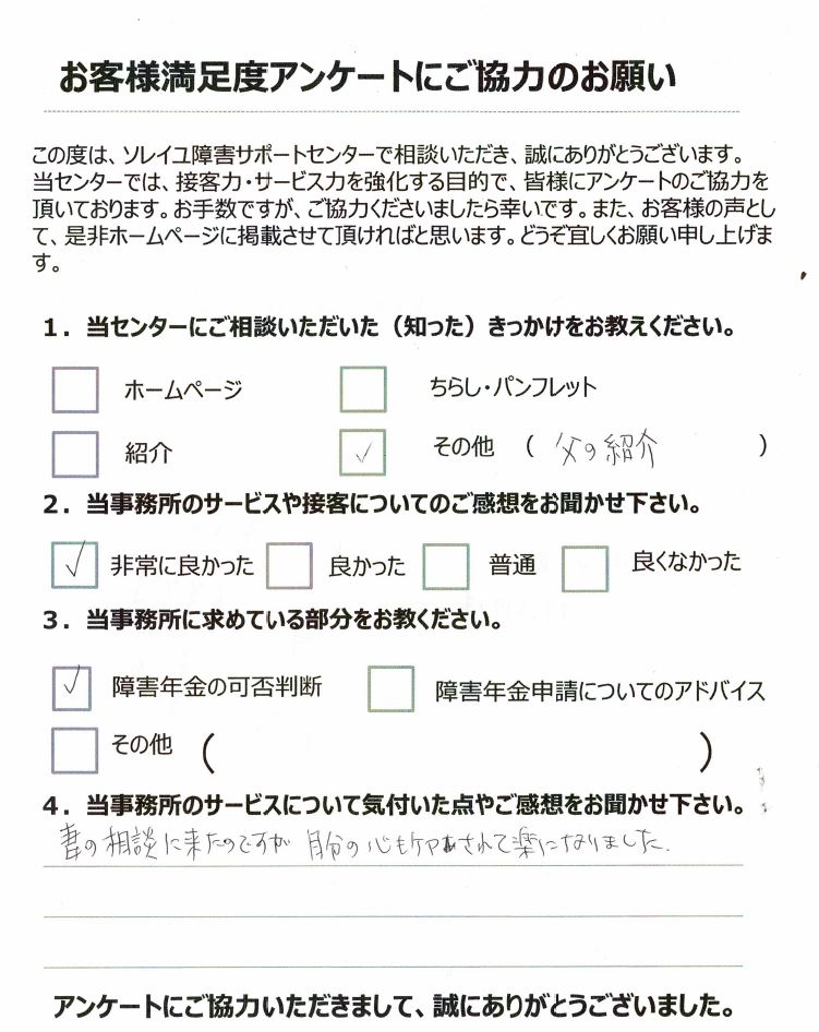 妻の相談に来たのですが、自分の心もケアされて楽になりました。